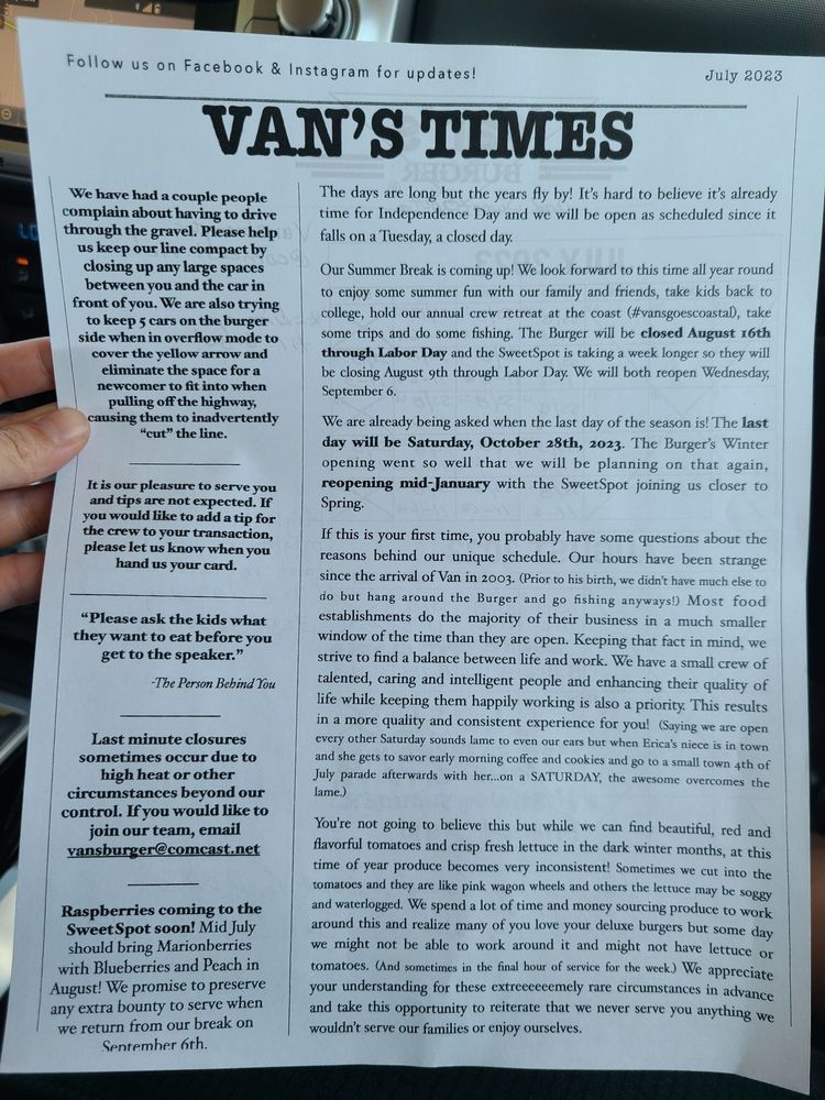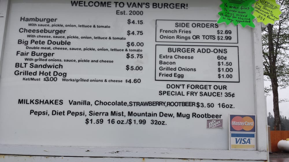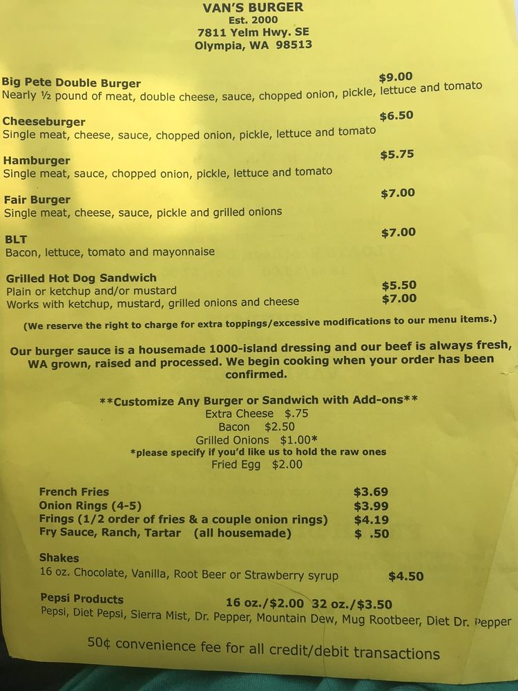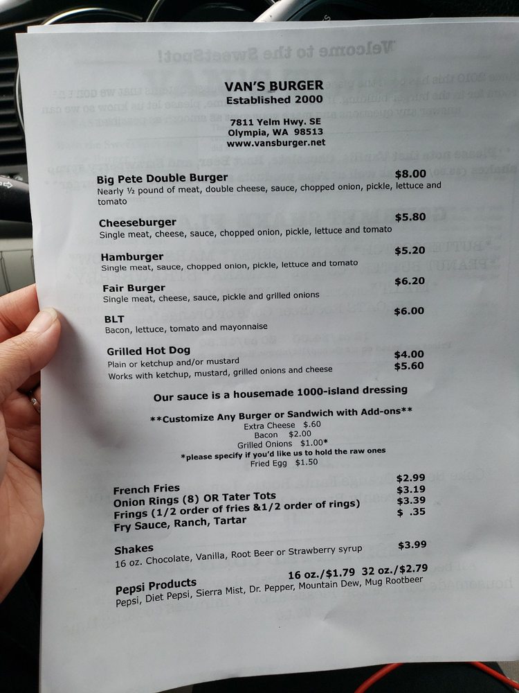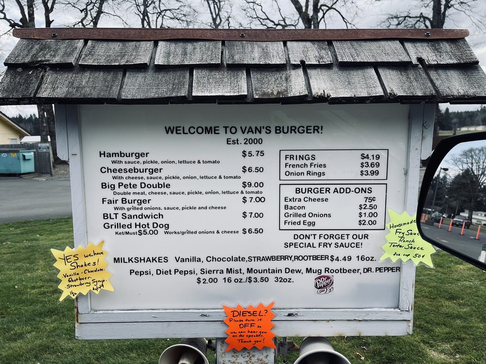 Van's Burger is a casual dining spot located in Olympia, WA, offering a range of delicious options for both meat lovers and vegetarians. The menu includes a variety of burgers, fries, shakes, and even Oreo shakes for dessert. Customers praise the friendly staff and fantastic service, making each visit a delightful experience. Must-try items include the Fair Burger, Big Pete Double, and the root beer milkshake. The restaurant also offers convenient drive-thru service, making it easy to grab a tasty meal on the go. With its welcoming atmosphere and mouth-watering food, Van's Burger is a must-visit destination for burger enthusiasts in the area.